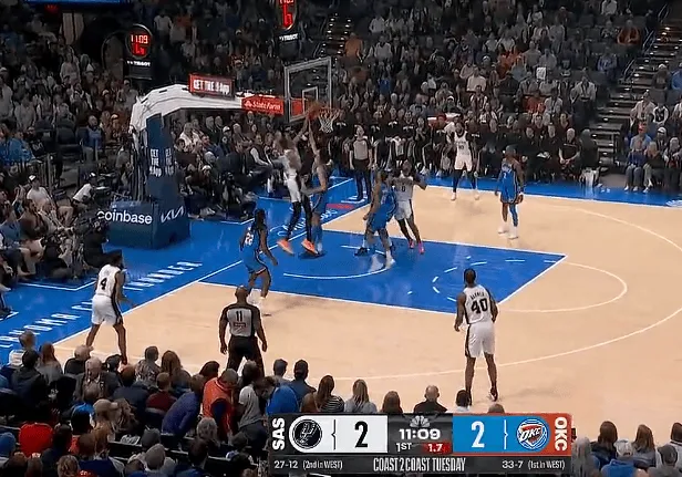 虎扑01月14日讯 NBA常规赛,雷霆对阵马刺的比赛正在进行中。